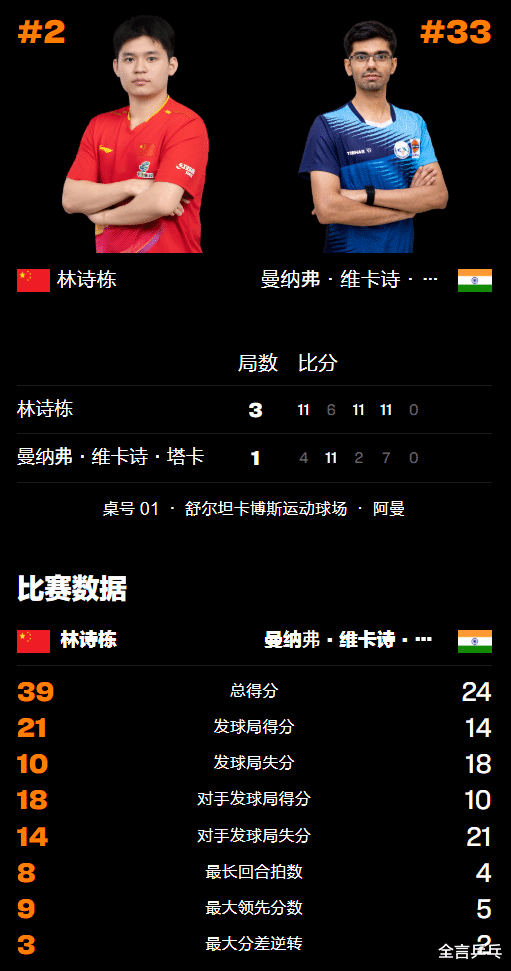 第三局塔卡依旧快速发动先得1分,但随后林诗栋赶快反击打出了我方的力量与旋转上风,很快便3-1反超敌手,被追回1分后连得8分以11-2粗陋拿下,由此而大比分2-1耕种将敌手逼入绝境,距离晋级仅一步之遥。