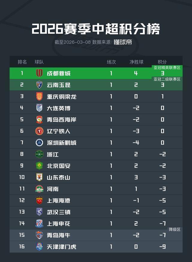 2026赛季中超联赛第1轮适度体育赛事直播,由于赛季初9支球队因反赌扫黑被罚分,因此积分榜也呈现出了绝顶的场合,成王人蓉城与云南玉昆赢球后3分领跑,四支球队有望鄙人轮开脱负分。