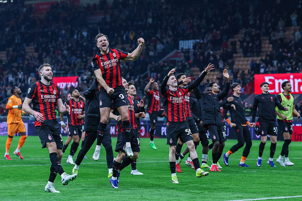 米兰球员赛背面向球迷看台欢庆得胜。